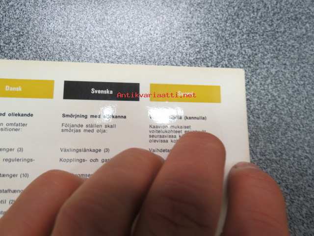| Saatavilla | 1 kpl | | Sivuja | 2 | | Kunto | K3 | | Sidonta/painoasu | Pienpainate | | Kielet | Suomi, Ruotsi, Saksa, Hollanti, Tanska, Englanti |