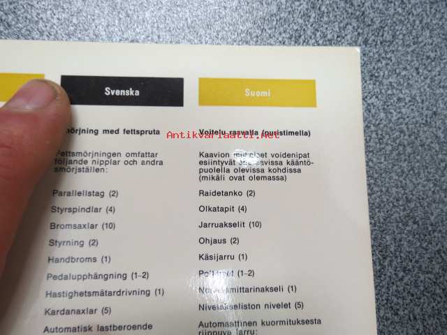 | Saatavilla | 1 kpl | | Sivuja | 2 | | Kunto | K3 | | Sidonta/painoasu | Pienpainate | | Kielet | Suomi, Ruotsi, Saksa, Hollanti, Tanska, Englanti |