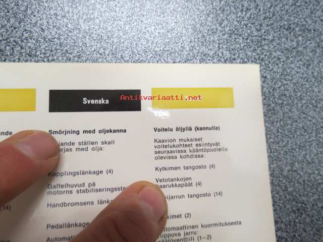 | Saatavilla | 1 kpl | | Sivuja | 2 | | Kunto | K3 | | Sidonta/painoasu | Pienpainate | | Kielet | Suomi, Ruotsi, Saksa, Hollanti, Tanska, Englanti |