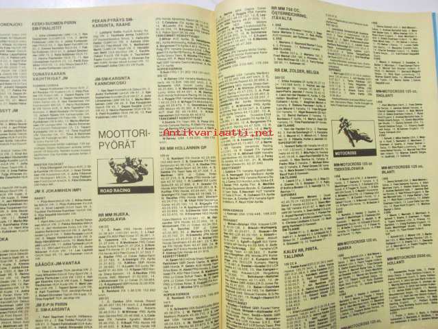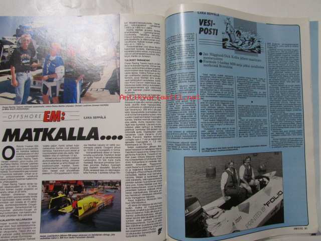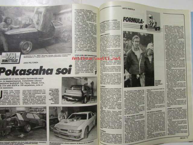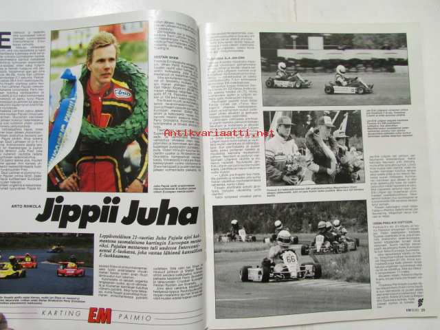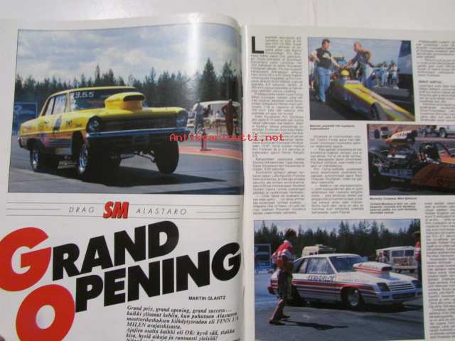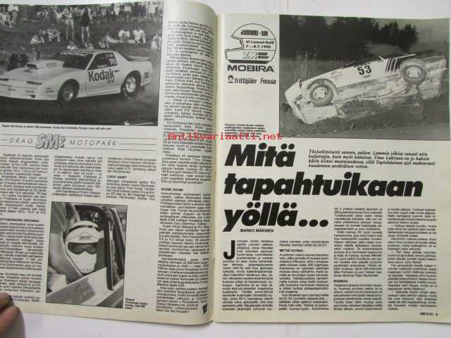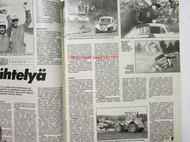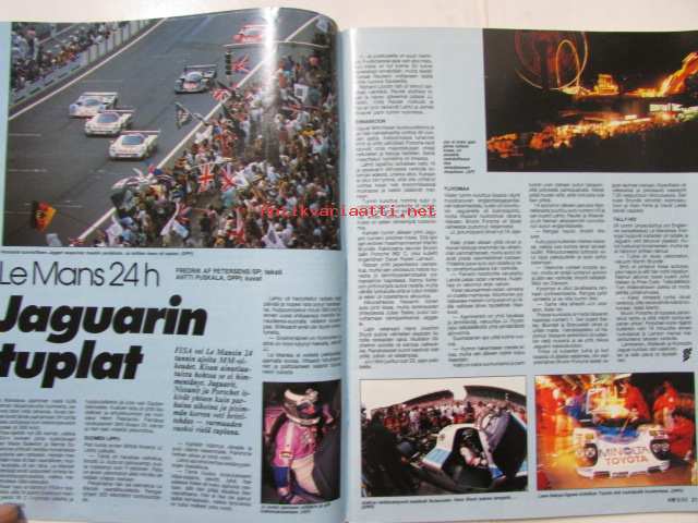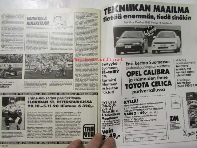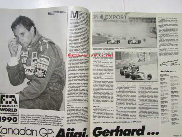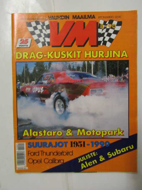 Vauhdin maailma 1990 nr 8 -mm. Drag SM, Le Mans 24, Formula 1 Kanada ja Mexiko GP:t, Trial-MM Suomi, Gilera SP 01, Opel Calibra, Truck-EM Mantorp, ALfa 164 16V, Ralli-SM, Rata-SM Kemora, F4 ja F3000 veneavaukset, Jyväskylän suurajot 1951-1990 Supercart-EM Paimio.22 x 28 cm.