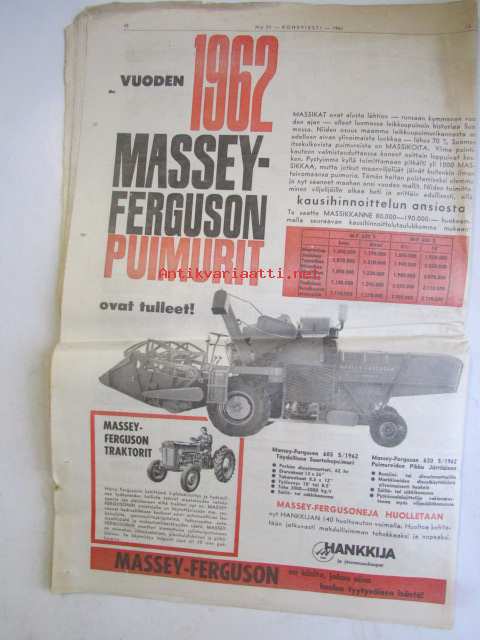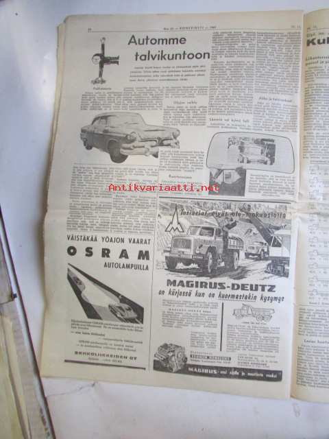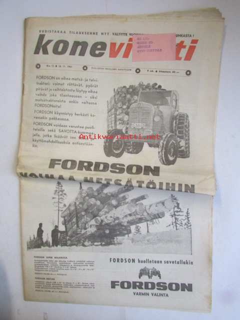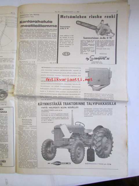 Koneviesti 1961 nr 23 -mm. Traktori uutuus, Mitä peltojen kuivatuksen parantamiseksi pitäisi tehdä, Kaivumaitten käsittely maatilalla, Massey Fergusonilta kaksi uutta leikkuupuimuria, Miten käytän moottorisahaani, Moottorisahat v. 1961 kaikki tekniset tiedot ja kuvat, Deutz-traktori iskee, Kotitarvikemyllyjä tekniset tiedot ja kuvat, Chrysler vuodelta 1962.