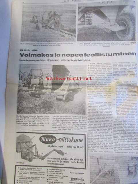Koneviesti 1964 nr 13 -mm. Yhdistelmäkone mallia Orimattila, Voimakas ja nopea teollistuminen luonteenomaista Ruotsin elinkeinoelämälle, Suomalainen