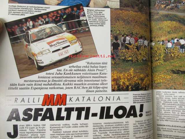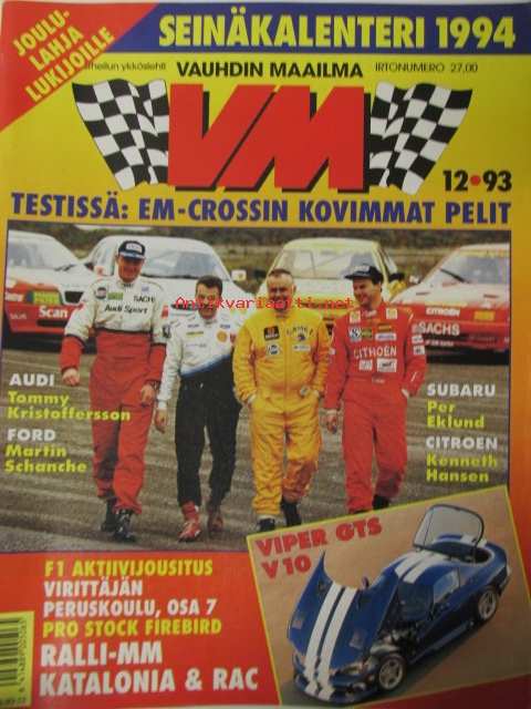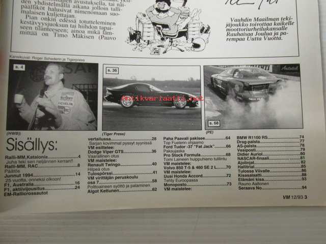 Vauhdin maailma 1993 nr 12 -mm. Formula 1 australia, F1 aktiivijousitus, Em-Rallicrossautot, Ralli-MM Katalonia RAC, Dodge Viper GTS, Renault Twingo, Ford Tudor -37 "Fat Jack" pro stock Formula, Honda Accord, Volvo 850T-5 & 460 SE 2 L, BMW R1000 RS, Virittäjän peruskuolu.22 x 29 cm.