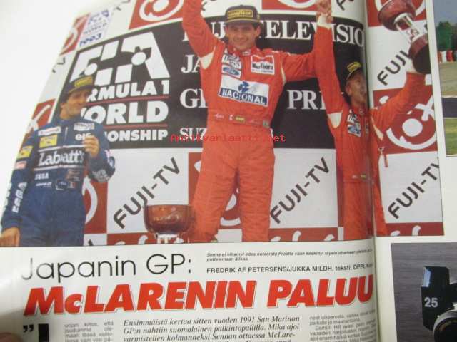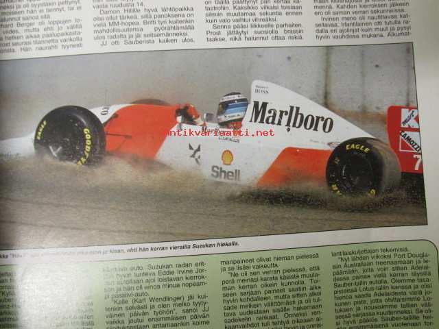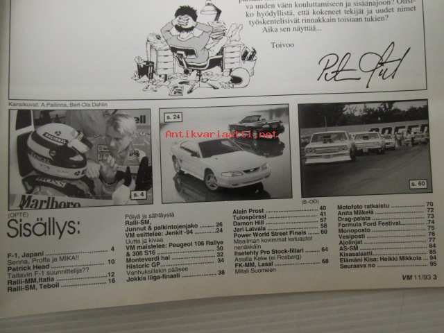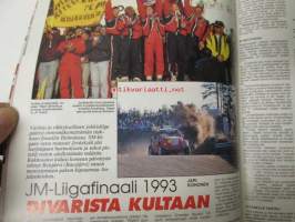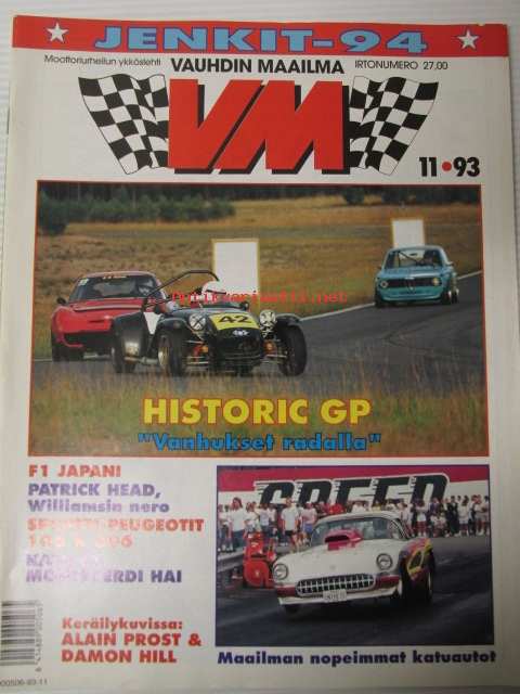 Vauhdin maailma 1993 nr 11 -mm. Formula 1 Japani, Patrick Head taitavin F1 suunnitteluja, Power World Street Finals, Formula Ford Festival, Ralli.Sm Teboil, Ralli-MM Italia, FK.MM Lasal, Jari Latvala, Alain Prost, Drag palsta, Peugeot 106 Rallye.22 x 29 cm.