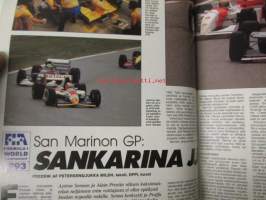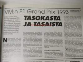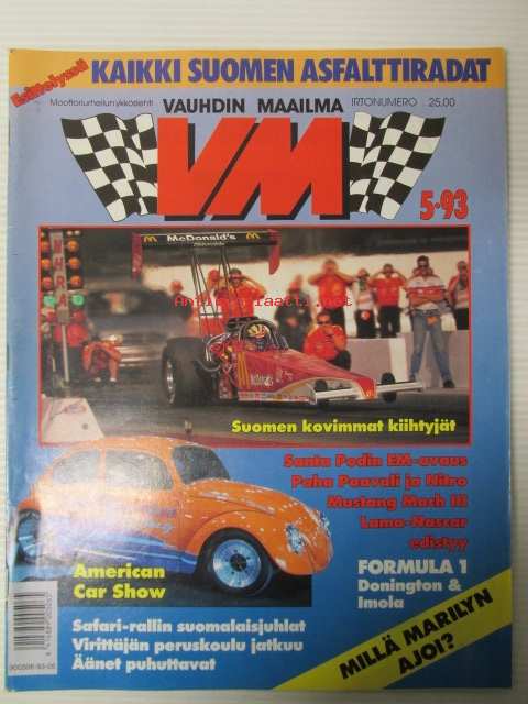 Vauhdin maailma 1993 nr 5 -mm. Formula 1 Donington ja Imola, Filmitähtien unelma-autot, Ralli-MM Safari, Mustang mach III, American Car Show, Drag riemukupla, Opel