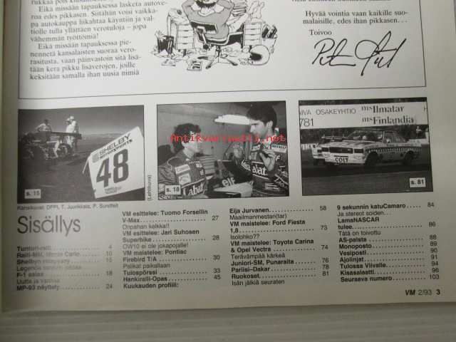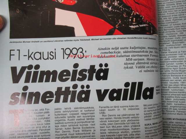 Vauhdin maailma 1993 nr 2 -mm. Formula 1 Asiaa, Ralli-MM monte Carlo, MP-93 Nayttely, Tuomo forsellin V-Max, Jari Suhosen SuperBike, Pontiac Firebird, T/A, Hankiralliopas, Eija Jurvanen Maailmanmestaritar, Ford Fiesta 1.8, Toyota Carina ja opel vectra, Paris-Dakar, LamaNascar, 9-sekunnin katuCamaro, katso sisältö kuvista tarkemmin.22 x 29 cm.