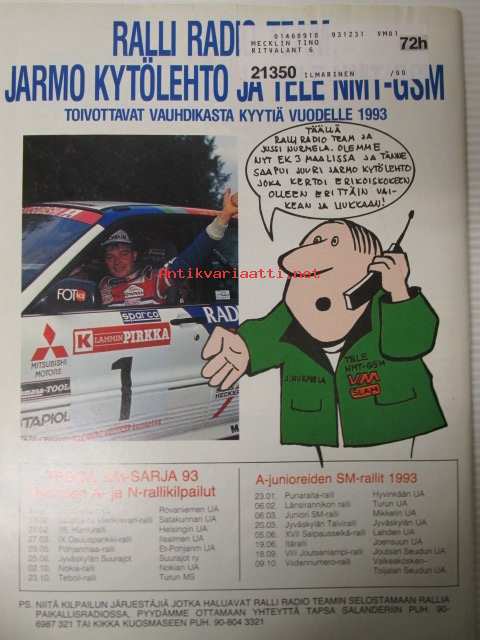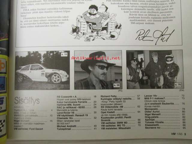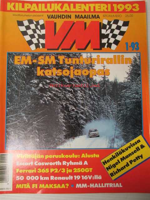 Vauhdin maailma 1993 nr 1 -mm. Formula 1 Maksaa?, Richard Petty kuningas vetäytyy radoilta, SS Oldsmobile-88, Opel Kadett, Kuukauden profiili Pentti Sinkkilä, Renault Chamade 16v, RAC ja Rallikausi -92/93, Ford Escort cosford r.A, Nigel Mansell, Tunturi-ralli opas, katso sisältö kuvista tarkemmin.22 x 29 cm.