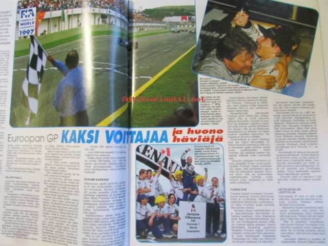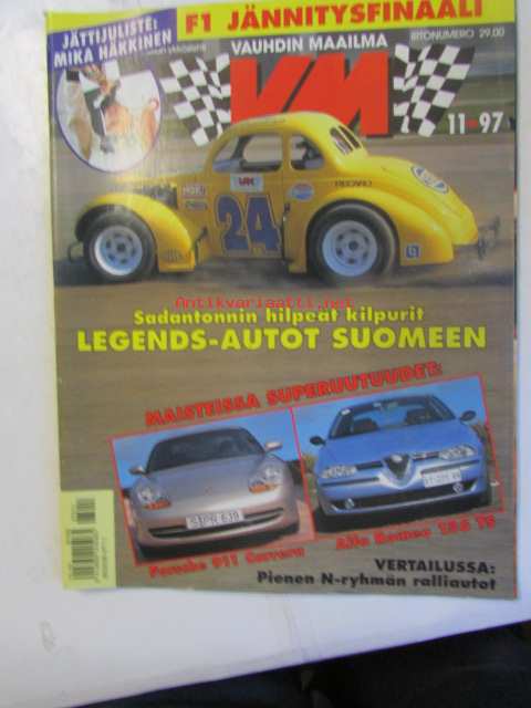 Vauhdin maailma 1997 nr 11 -mm. Legendat tulevat, Porsche 911 Carrera, Kuorma-autojen FIA-Cup, Formula 1Luxemburg, Japani ja Espanja Gp:t, Ralli-SM Helsinki, Ralli-MM San Remo, Mitsubishi GDI-suoraruiskumoottori, Alfa Romeo 156 2.0 TS 16V, Ratakausi 1997, Motocross-SM joukkuekilpailu.21 x 29 cm.