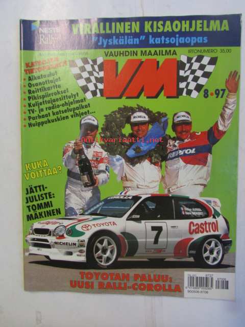 Vauhdin maailma 1997 nr 8 -mm. Ralli-SM kokkola ja Kouvola, Channel 4, Formula 1 Ranska, Englanti ja saksa GP:t, Rata-SM Virtasalmi, Kuorma-autojen FIA-Cup, Rallicross-EM Ruotsi ja Suomi, Drag Race Juhannus&Alastaro, Motocross-MM Vantaa. Ei sisällä kisaohjelmaa21 x 29 cm.