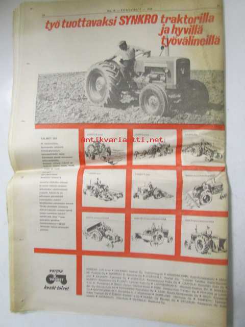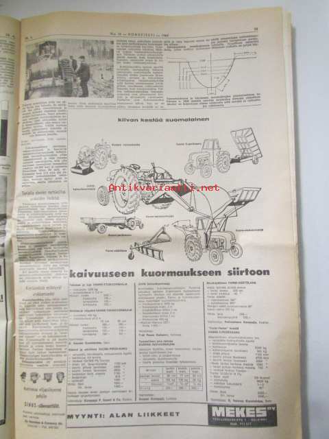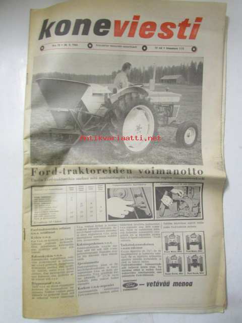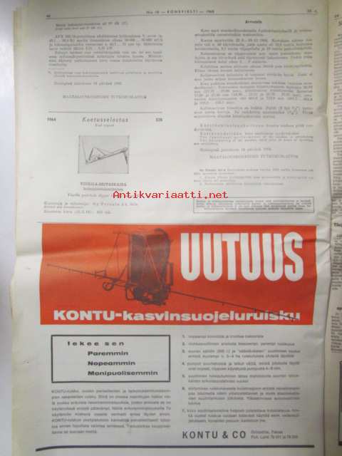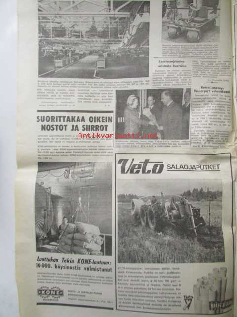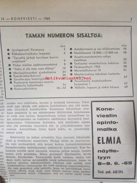 Koneviesti 1965 nr 10 -mm. Jyrsin paraati Veronassa, Rikkakasviruiskutus laajenee, Yhden miehen sadetusmenelmä, "Italia ei ole maa vaan elämys", Puutavaran kuormaaja maastotraktorin lisälaitteeksi, Autokorroosio ja ehkäiseminen, Metsänojitusurakat ajankohtaisia, Terveyttä ja järkeä tarvitaan kasvinsuojelussa, Savotta-ajon huomispäivää, Perustamme Maatalouskorjaamon, Perämoottorit 1965 tekniset tiedot ja kuvat, henkilöautot 10000-12000mk, Asuntovaunutoiminta valtaa maailmaa, pyörätraktorit / telatraktorit vuosiluettelo + kuvia