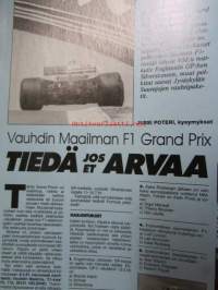 Vauhdin Maailma 1991 nr 3 -mm. Formula 1 kausi 1991 nyt on tosi kyseessä, F1 matkaopas ja lukija kilpailu, Ralli-MM Ruotsi ja Monte Carlo,Ralli-EM hankiralli, Los Angeles & Detroit näyttelyt, chevy Camaro SS-69, Renault 21 Quandra, Jyväskylän suurajot Anita Mäkelä, Pekka Vehkonen, Varikolla kuiskitaan.21 x 29 cm.