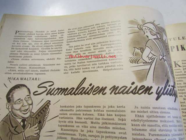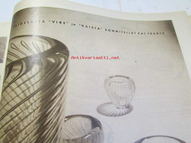 Suomen Kuvalehti 1952 nr 11, (pankin suurlahja osakkeenomistajilleen (Kansallis-Osake-Pankki jakaa Rauma-Repola Oy:n osakkeet laajoille piireille), Mika Waltari: Suomalaisen naisen ylistys, kokos sivun mainos taidelasia Vire ja Kaisla sommitellut Kaj Franck - Nuutajärven lasitehdas