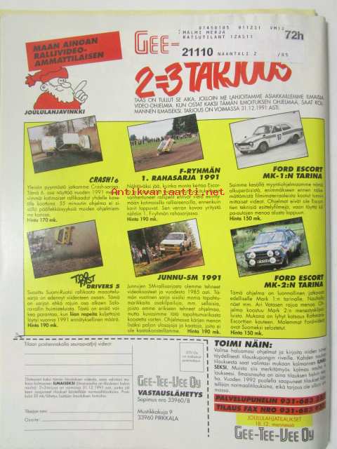 Vauhdin Maailma 1991 nr 12 -mm. Formula 1 Japani ja Autralia GP:t, F1 polttoaineet eri sortin myrkkyjä, ford Capri Pro Street, Drag-MM Pomona, Ayrton Senna, Nigel Mansell, Ford Festival Lada Buggy, Honda Civic VTi, Ford Escort RS 2000, Ralli-MM Espanja ja RAC, Ford Anglia -54 Vikkelä nakkikioski, Tommi Ahvala.21 x 29 cm.