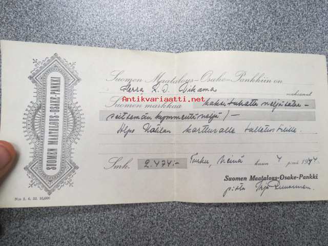 Suomen Maatalous-Osake-Pankkiin on herra K. Vikama maksanut 2422 mk Alpo Kotilan karttuvalle talletustilille 4.7.1944 -talletuskuitti