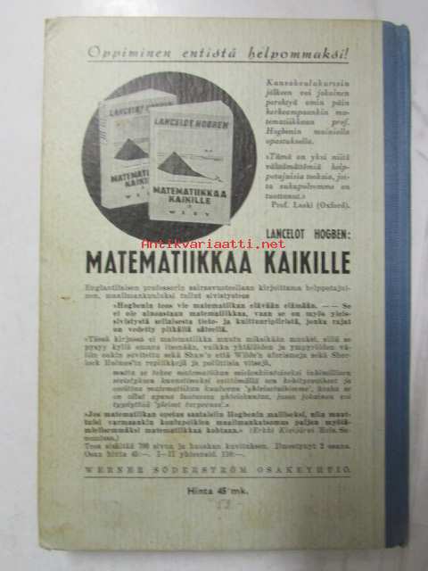 | Saatavilla | 1 kpl | | Julkaisuvuosi | 1939 | | Sivuja | 140 | | Painos | 2. | | Kunto | K2 | | Sidonta/painoasu | Sidottu (kovak.) | | Kielet | Suomi |