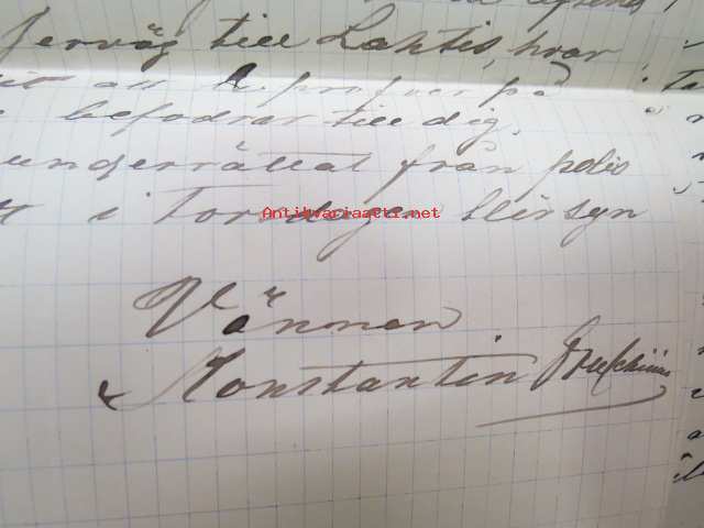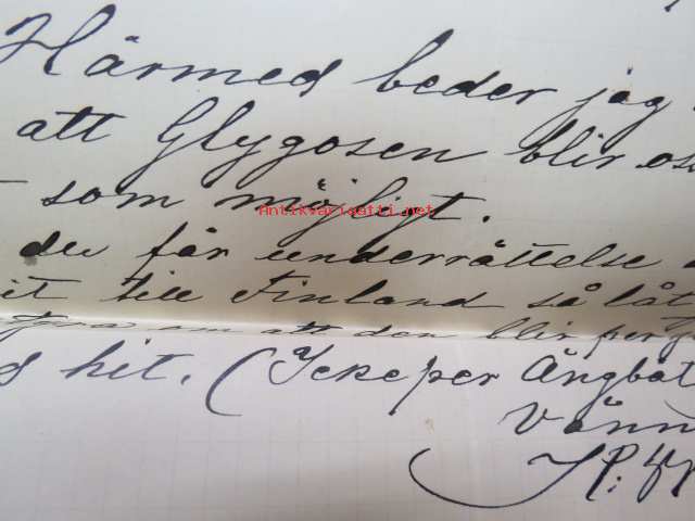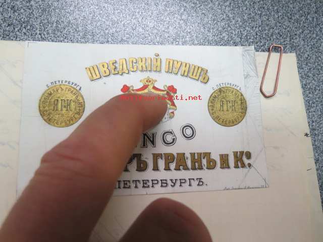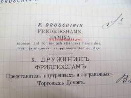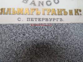 Appelberg-Druschinin -kirjeenvaihtoa ruotsinkielellä Pietarista Heinolaan koskien viinanpolttoasioita (-tehtailua) 1890-luvulla, mukana Hjalmar Grahn ja Co:n "Schwedskij punsh" / "Banco" -etiketti, viina, jota valmistettiin Pietarissa