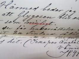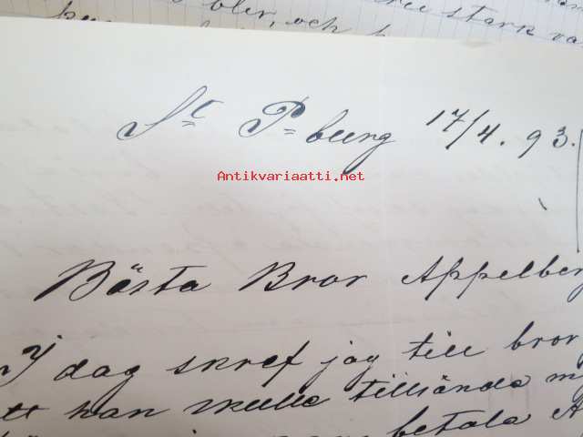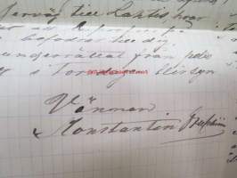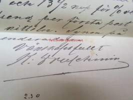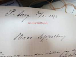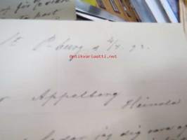 Appelberg-Druschinin -kirjeenvaihtoa ruotsinkielellä Pietarista Heinolaan (Heinola) koskien viinanpolttoasioita (-tehtailua) 1890-luvulla, mukana Hjalmar Grahn ja Co
