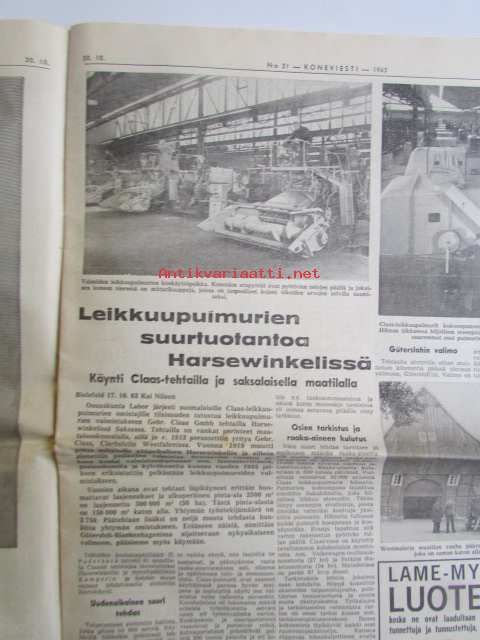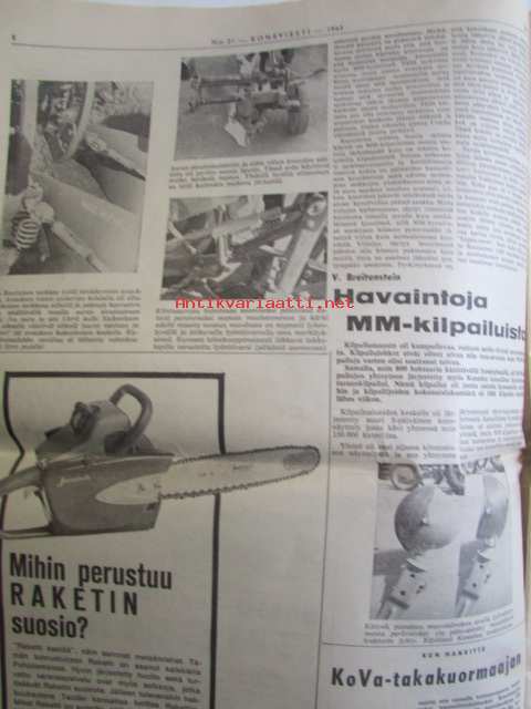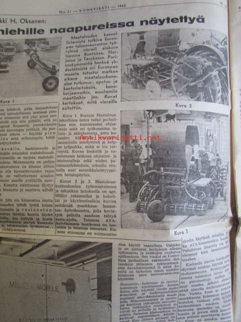 Maaseudun Ammattilehti Oy, 1963 Koneviesti 1963 nr 21 -mm. Keskitettyä konetietoa USAsta, koneuutuuksia naapurimaasta, MM-kynnöt Kanadassa, Leikkuupuimureiden suurtuotantoa, Maatilan koneellistaminen, Talvirengaskuvasto, Kiertomäntämoottorin kehitysvaiheista, Heinittymisen kemiall. torjunta metsänviljelyaloilla, Raivaustraktorit ja telakuormaajat, Maataloustraktorin kehitysvaiheista, Katso tarkemmin sisältöä kuvista.