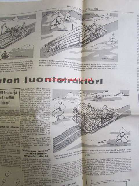 Koneviesti 1963 nr 21 -mm. Keskitettyä konetietoa USAsta, koneuutuuksia naapurimaasta, MM-kynnöt Kanadassa, Leikkuupuimureiden suurtuotantoa, Maatilan