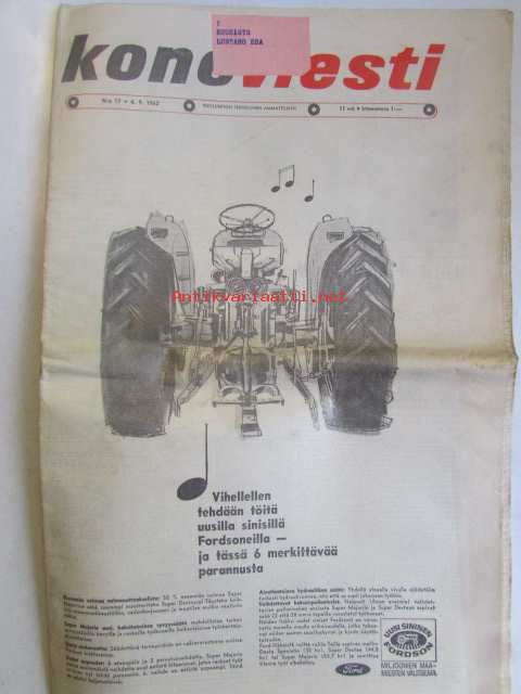 Koneviesti 1963 nr 17 -mm Varsinainen metsäojakaivuri, Maatalousnäyttelyistä, Nuijamaalle kuormattiin soraa, Sokerijuurikkaan korjuukneita, Traktorikantamme, Nelirumpuinen vinssi, Pyörätraktori metsätöissä, Autotraktori maa- ja metsätaloudessa, Terveisiä Englannista, Uusia koneita maatalouspajoihin, Katso tarkemmin sisältöä kuvista.
