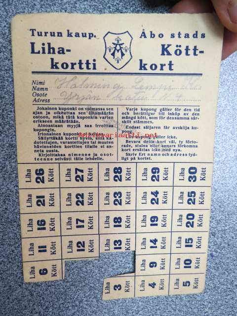 Turun Kaupungin Lihakortti / Köttkort Lempi Holming -vuoden 1919 pula-ajan säännöstelykortti