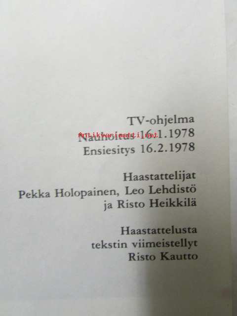 | Saatavilla | 1 kpl | | Julkaisuvuosi | 1979 | | Sivuja | 92 | | Kunto | K3 | | Sidonta/painoasu | Sidottu (kansipaperit) | | ISBN | 951-0-09418-8 | | Kielet | Suomi |