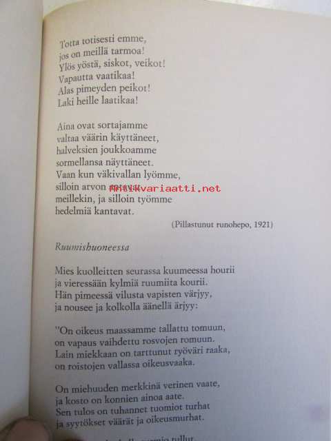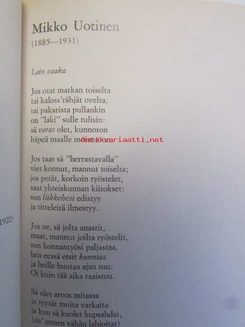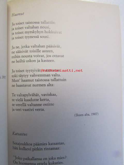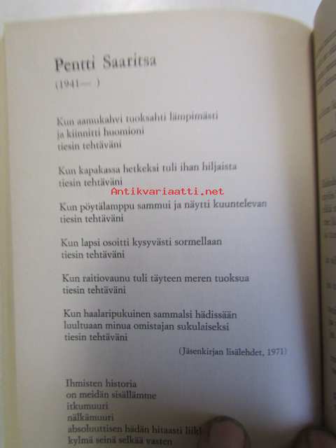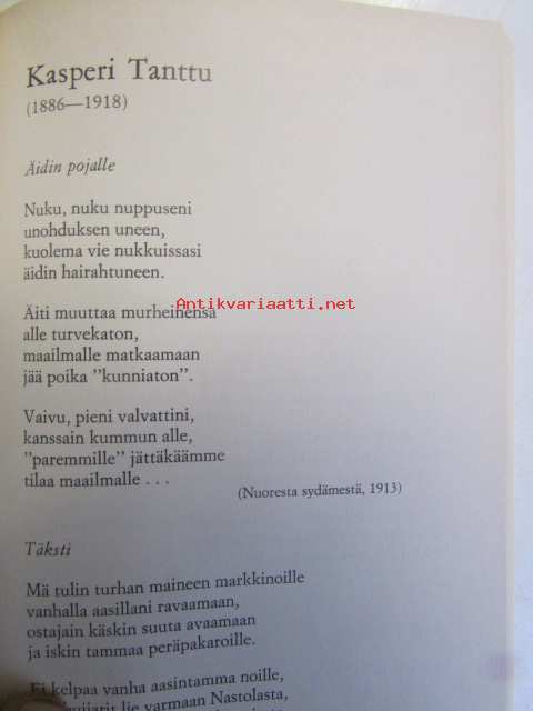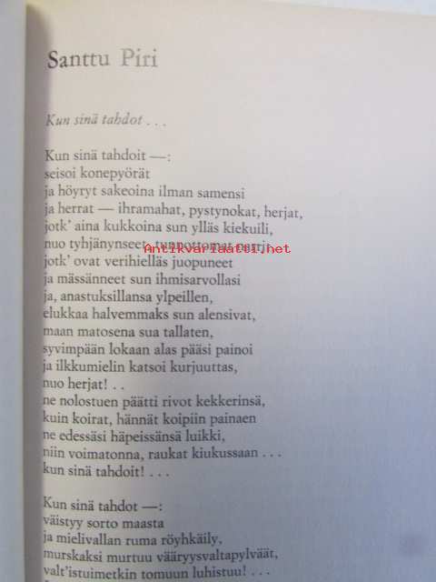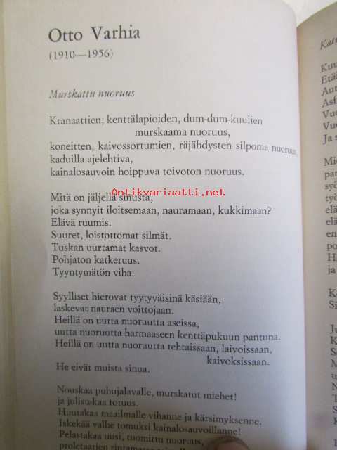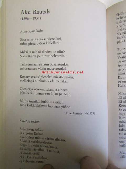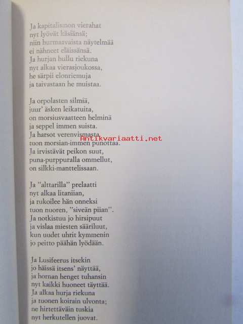 | Saatavilla | 1 kpl | | Julkaisuvuosi | 1977 | | Sivuja | 328 | | Kunto | K2 | | Sidonta/painoasu | Nidottu (pehmeäk.) | | ISBN | 951-30-3674-X | | Kielet | Suomi |