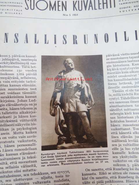 Suomen Kuvalehti 1954 nr 5 30.1.1954 Kansikuvassa Runebergin patsas (Runbergin syntymästä 150 vuotta vuonna 1954). Aiheita: Sao Paulo, 1954. Oiva Paloheimo lähikuvassa -artikkeli. Tunnetko lapsen kaverit; millaisessa seurassa poika liikkuu, artikkeli vuodelta 1954.