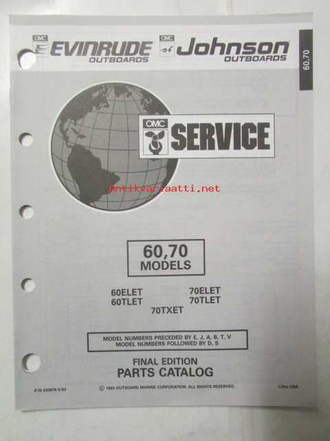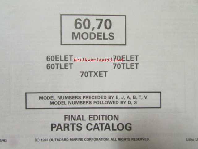 Johnson-Evinrude huolto 1993, 60, 70 Models, final edition Parts catalog, katso tarkemmat malli merkinnät kuvasta.