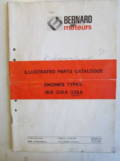 Bernard Motoeurs Illustrated Parts Catalogue, Engines Types 18B, 318A, 328A -Kiskoporakone Varaosaluettelo, katso kuvasta mallinumerot tarkemmin