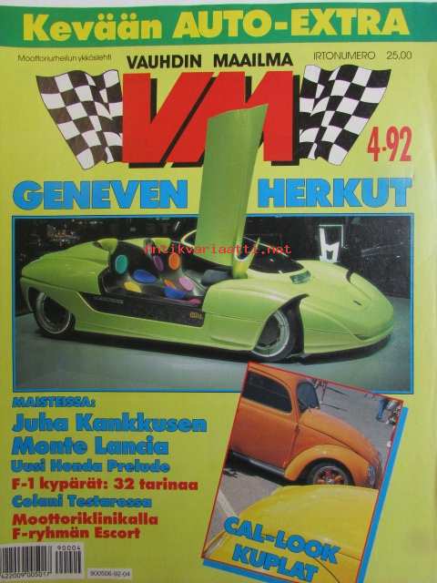 Vauhdin Maailma 1992 nr 4 -mm. VM maistelee Juha Kankusen Monte Lancia Martin Holmes pääsi maiskuttamaan, Formula 1 GP:t Kyalami ja Mexico, F1 Kuskien kypärät, Ralli-MM Portugal, Daytona Bike Week Harrikoita harrikoita ja taas harrikoita, Geneven Autonäyttely, Ferrari Colani 300km/t plus, Cal-look, Pekka Vehkonen, Tommi Ahvala, Honda Prelude, Jyväskylän suurajot, VM moottoriklinikka Ford, Drag palsta, Kevään Hod rod näyttely Hesa ja Nääsville, Rallijunnut Jämsä.21 x 29 cm.