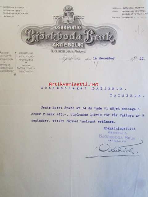 Osakeyhtiö Björkboda Fabriks Aktiebolag Björkboda Finland. 16 december 1921