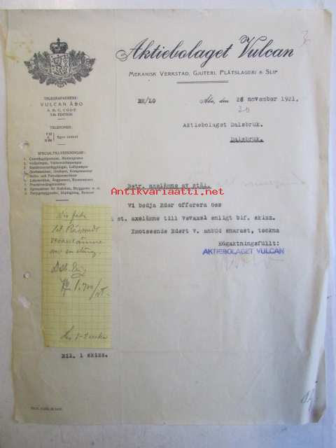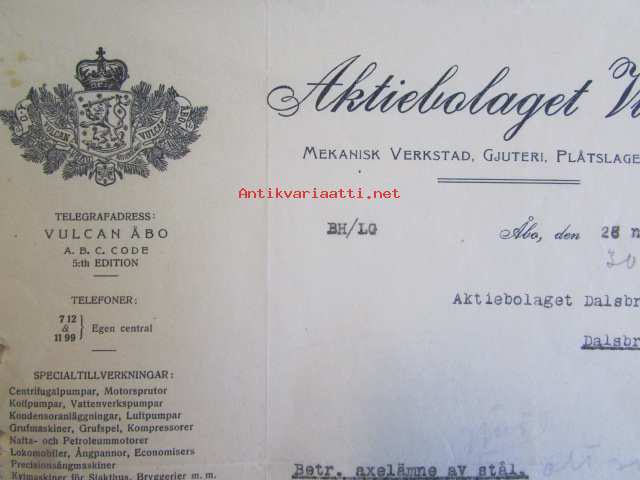 Aktiebolaget Vulcan Åbo, tarjous, 28. november 1921