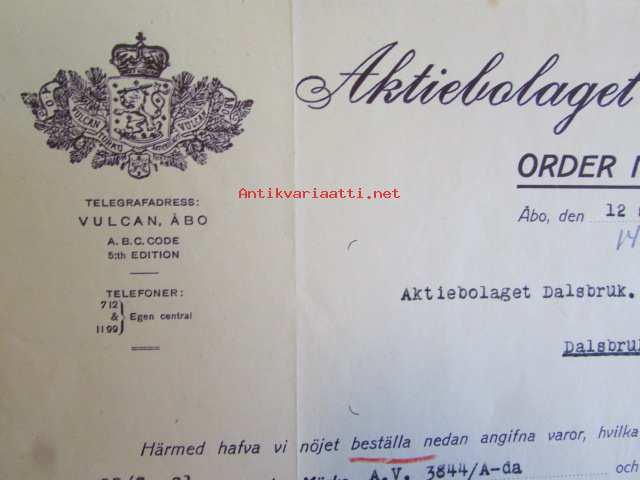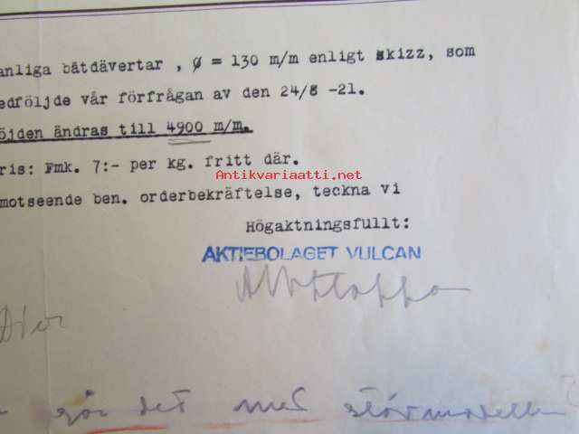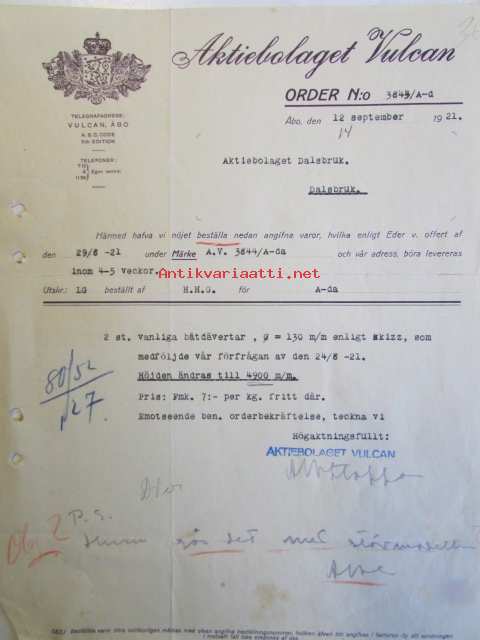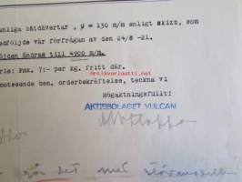 Aktiebolaget Vulcan Åbo, tilaus, 12. september 1921 -asiakirja
