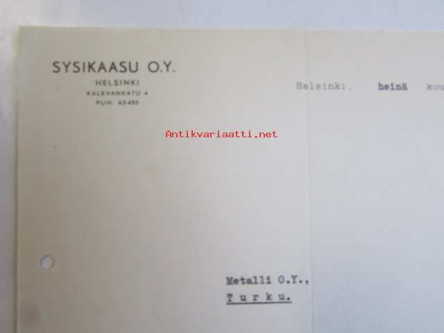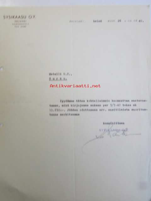 Sysikaasu O.Y.ltä Metalli O.Y. maksumuistutus Helsinki 26. heinäkuuta 1940 -asiakirja
