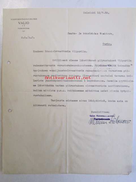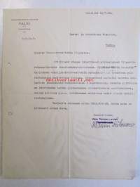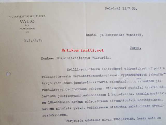 Voinvienti-Osuusliike Valio rl. Helsinki kesäkuun 12/7-39 -asiakirja