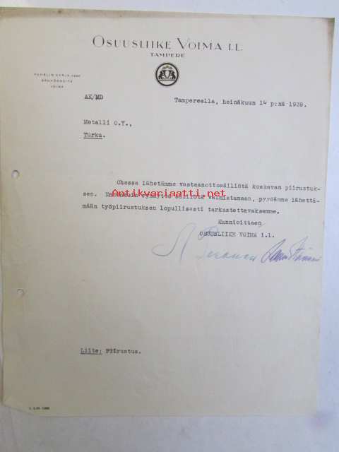 Osuusliike Voima I.L Tampereella, heinäkuun 10. 1939 -asiakirja