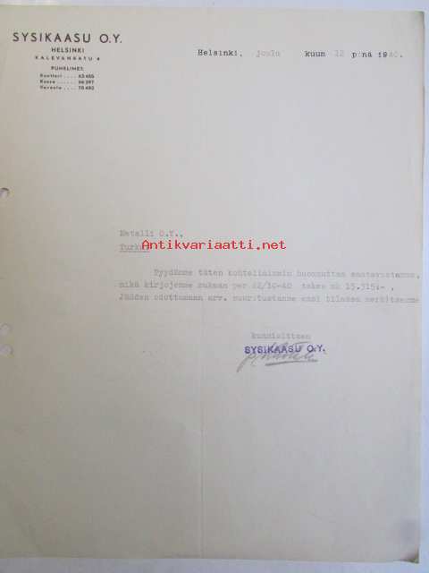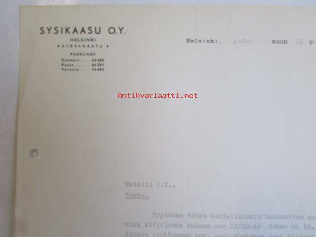 Sysikaasu O.Y. Helsinki, joulukuu 12. 1940 -asiakirja