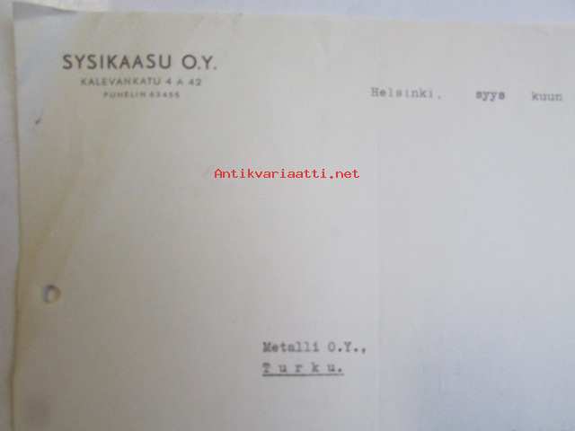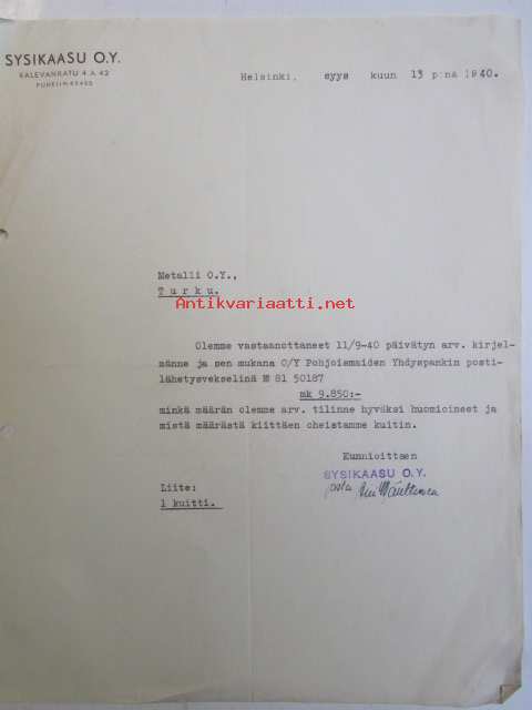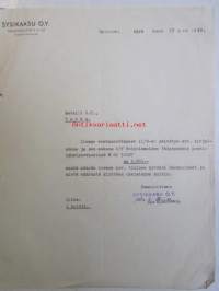 Sysikaasu O.Y. Helsinki, syyskuu 13. 1940 -asiakirja