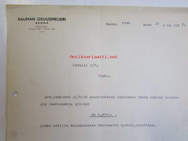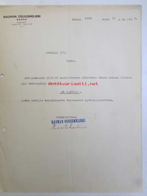 Rauman Osuusmeijeri Rauma kesäkuun 16. 1939 -asiakirja