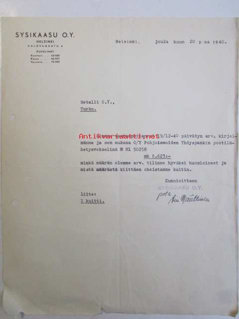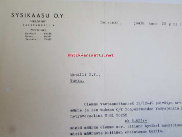 Sysikaasu O.Y. Helsinki, joulukuu 20. 1940 -asiakirja