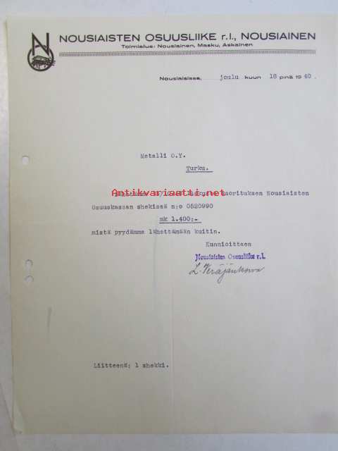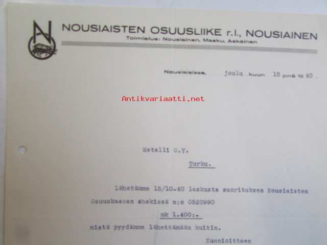 Nousiaisten Osuusliike r.l Nousiaisissa joukukuun, 3. 1940 -asiakirja