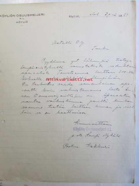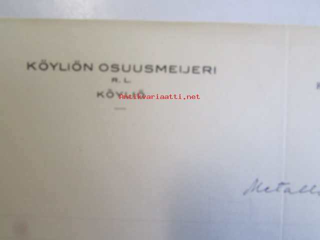 Köyliön Osuusmeijeri, Köyliö, elokuun 3. 1939 -asiakirja