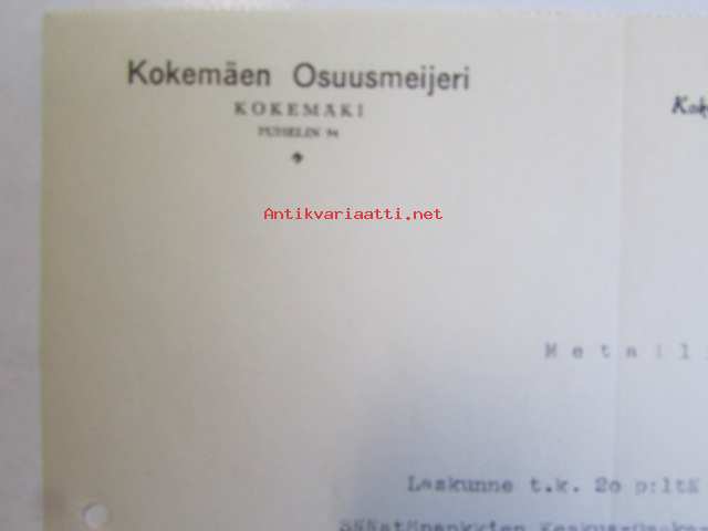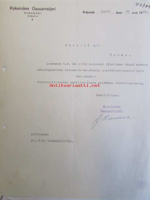 Kokemäen Osuusmeijeri, Kokemäki, huhtikuun 22. 1939 -asiakirja