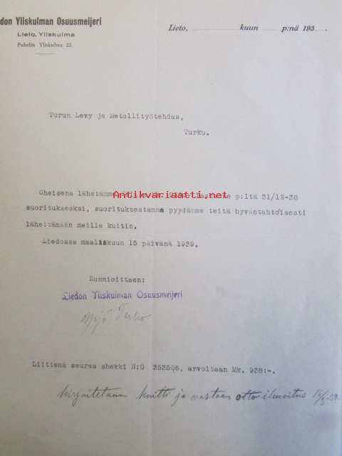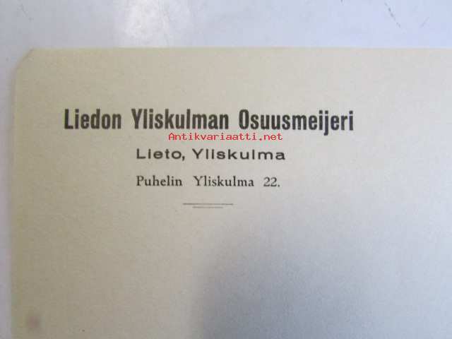 Liedon Yliskulman Osuusmeijeri, Lieto, maaliskuun 15. 1939 -asiakirja