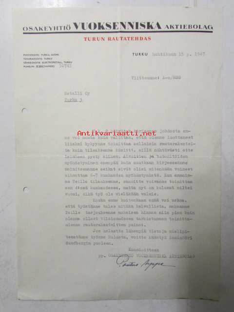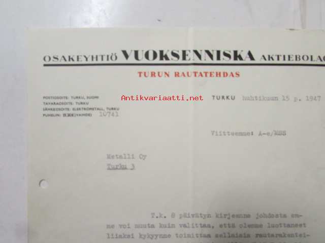 Osakeyhtiö Vuoksenniska Aktiebolag, Turun Rautatehdas, Turku huhtikuu 15. 1947 - asiakirja