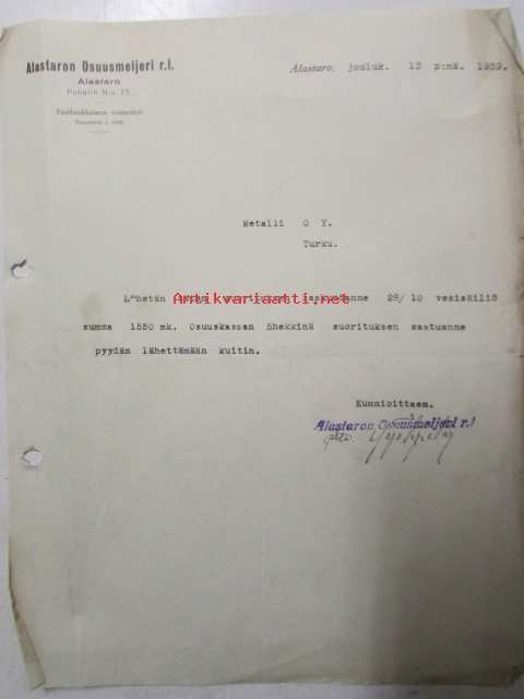 Alastaron Osuusmeijeri r.l. Alastaro joulukuun 13. 1939 - asiakirja