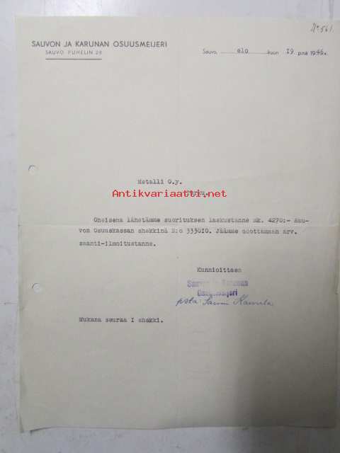 Sauvonja Karunan Osuusmeijeri, Sauvo elokuun 19. 1946 -asiakirja