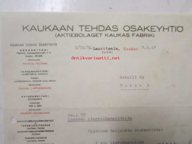 Kaukaan Tehdas Osakeyhtiö, Lauritsala Kaukas 7.5.47 -asiakirja