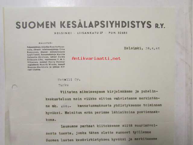 Suomen kesälapsiyhdistys r.y. Helsinki 30.4.46 -asiakirja